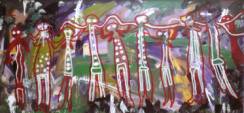 8. De kangaroe man Kandarik. Maakte van zichzelf een heilig schilderij in een grot bij Niwbawah. Gaf de Aboriginals een grote trom voor ceremonies.